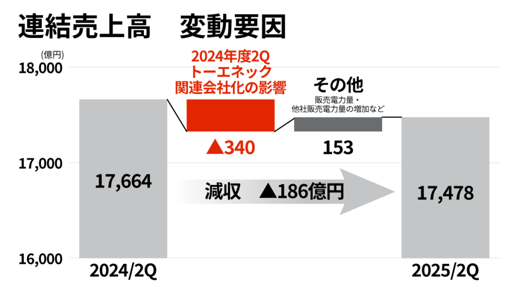 売上高は1兆7,478億円(前年同期比▲1.1%)と減収でしたが、これはトーエネックの関係会社化による会計上の影響が主因。実質的には販売電力量が増えており、本業の電力事業は堅調に推移しています。