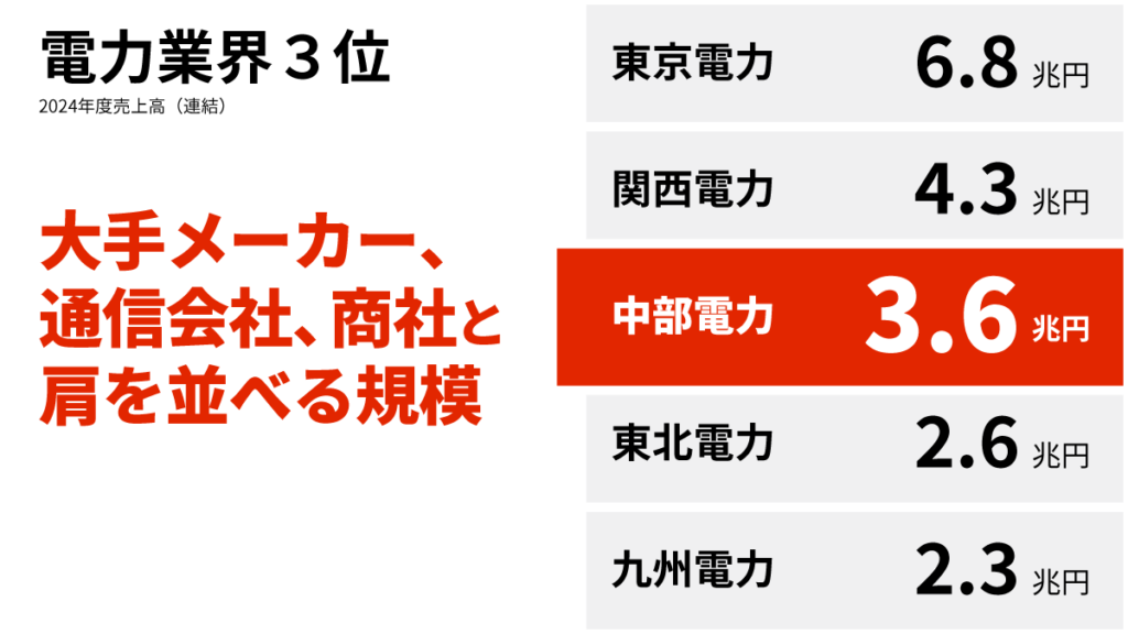 中部電力は、東京電力・関西電力に次ぐ国内3位の電力会社で、2024年度の売上高(連結)は約3.6兆円を誇る大企業です。電力の小売、送配電、発電・燃料、再エネ、不動産など複数の事業を持ち、日本の産業や暮らしを支えるインフラ企業として長い歴史を持っています。