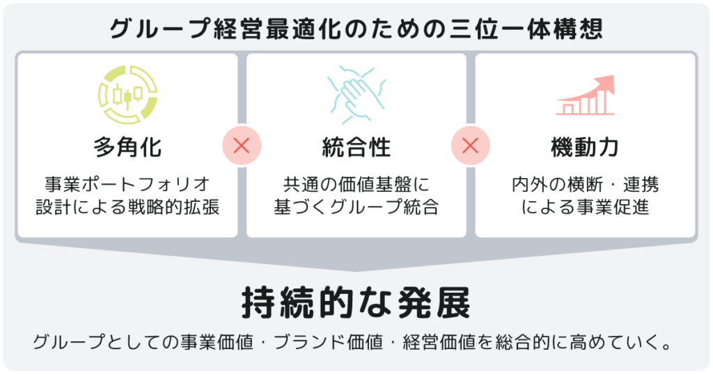 - 単一事業依存から脱却し、多角化×統合性×機動力で成長と安定を