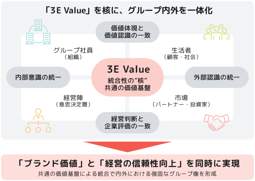 この「3E Value」を共通の価値基盤として、グループの内外で判断の核をそろえる考え方です。社員や経営陣が同じ方向を向きやすくなるだけでなく、顧客や社会、投資家やパートナーにとっても、「このグループは何を大事にしているのか」が理解しやすくなります。