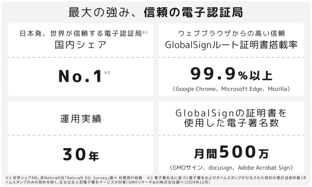 電子認証・印鑑事業は、同社の収益基盤であり最大の強みです。同社は国内No.1・世界トップ4の電子認証局として、30年以上の運用実績を誇ります。GlobalSignのルート証明書搭載率は99.9%に達し、Google、Microsoft、Mozillaなど主要ウェブブラウザから高い信頼を獲得。月間500万件以上の電子署名に同社の証明書が使用され、230を超える国と地域でサービスが導入されています。