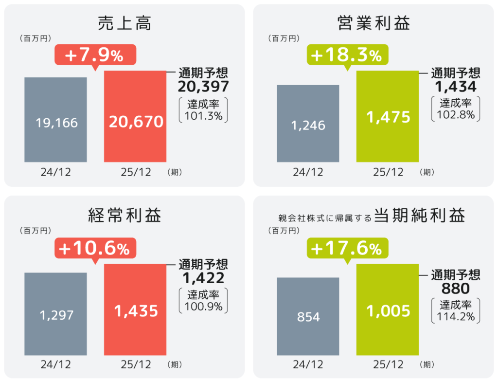 2025年12月期の連結業績は、売上高が206億7,000万円(前年同期比7.9%増)、営業利益が14億7,500万円(同18.3%増)となり、いずれも過去最高を更新しました。