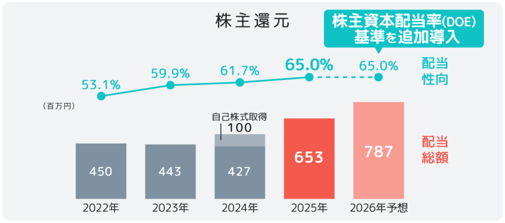 さらに、2026年12月期からは、配当性向65%以上に加えて株主資本配当率(DOE)基準を追加導入します。これにより、利益水準にかかわらず安定的な配当が期待できるようになり、株主還元の予見可能性が高まります。
