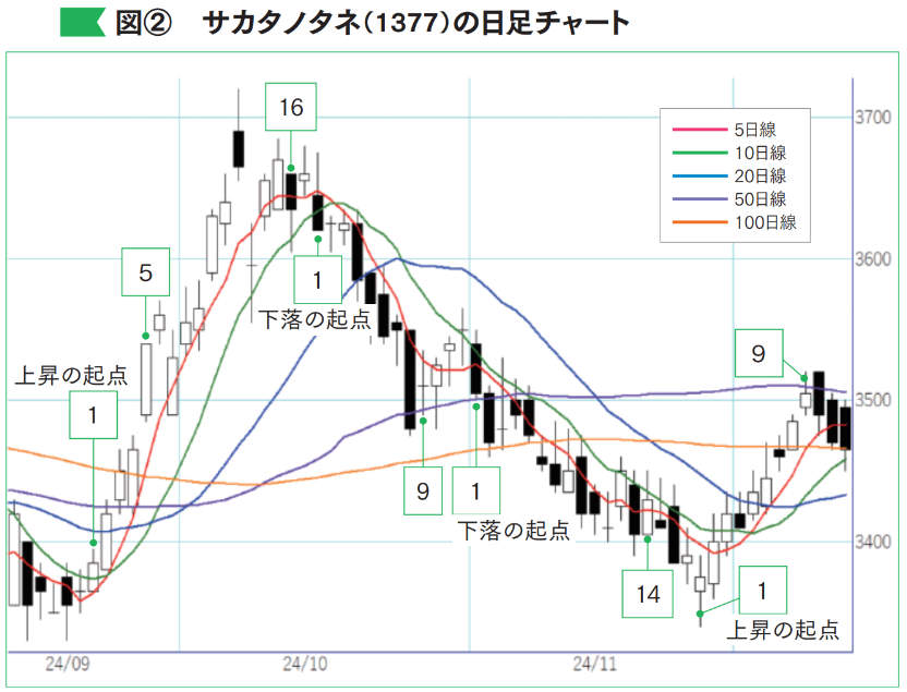 次に、2024 年10月に下落が始まり、その起点を「1」として数えましたが、9本目に十字線、翌日と翌々日には陽線が出て、短期的に上昇しました。そうなると、カウントは終了です。11月初めの陰線を下落の起点「1」としてカウントし直します。すると14本目に陽線が出たので、ここが手じまいポイントとなります。