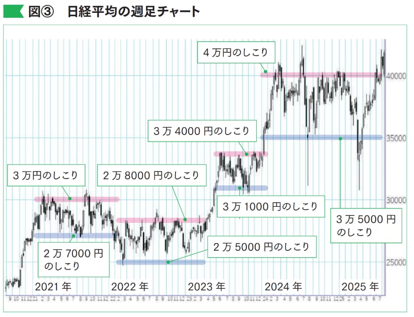 特に日経平均株価は、キリのいい株価が重要な節目になりやすい傾向があります。2万 9000 円、3万円、3万1000 円、3万2000 円など、1000 円単位の株価が「しこり」となり、上昇トレンドではそこで頭打ちに、下落トレンドでは下げ止まる局面が多く見られるのです。