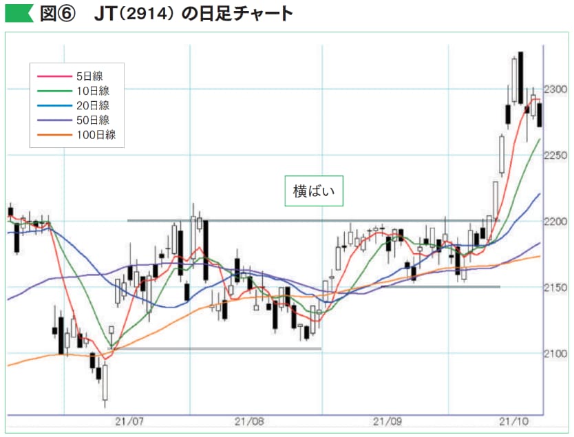さて、株価が上昇すると、最初に一番短期の 5 日線が上向きになり、次いで 10 日線、20 日線、50 日線、100 日線の順で上向きになっていくパターンが多いです。上から 5 日線、10 日線、20 日線、50 日線、100 日線の順番で並ぶと完璧な上昇トレンドです。
