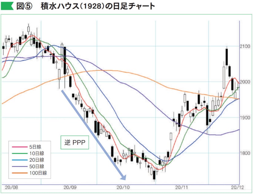 反対に下落トレンドは 5 日線が最初に下向きになり、上から 100日線、50 日線、20 日線、10 日線、5 日線の順番になります。これを「逆 PPP」と呼びます(図⑤)。