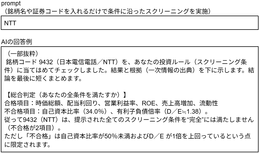 以降は、このスクリーニング用プロジェクトにプロンプトを入力していきます。例えば、銘柄名や証券コードを入力すれば、ルールに合致するかを AIが瞬時に判定します。
