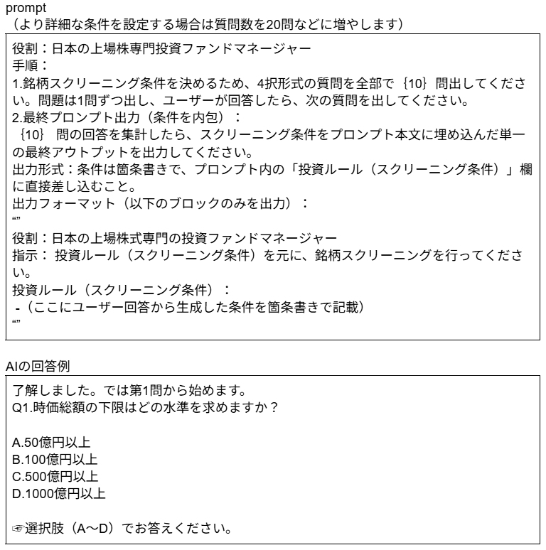 投資家としては、これらの指標をできるだけ多く学び、使いこなせると役立ちます。しかし、ここでは数多くの指標から選ぶことはせず、AIからの質問に回答することで、自分のスクリーニング条件を浮き彫りにし、必要な指標を使うという、「ゴールから逆算したアプローチ」を採用します。