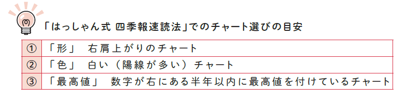 そこで、「はっしゃん式 四季報速読法」では、まず株価チャートが右肩上がりの銘柄を探して選抜することを「ステップ1」とし、あとから業績をチェックすることを「ステップ2」とすることにしました。