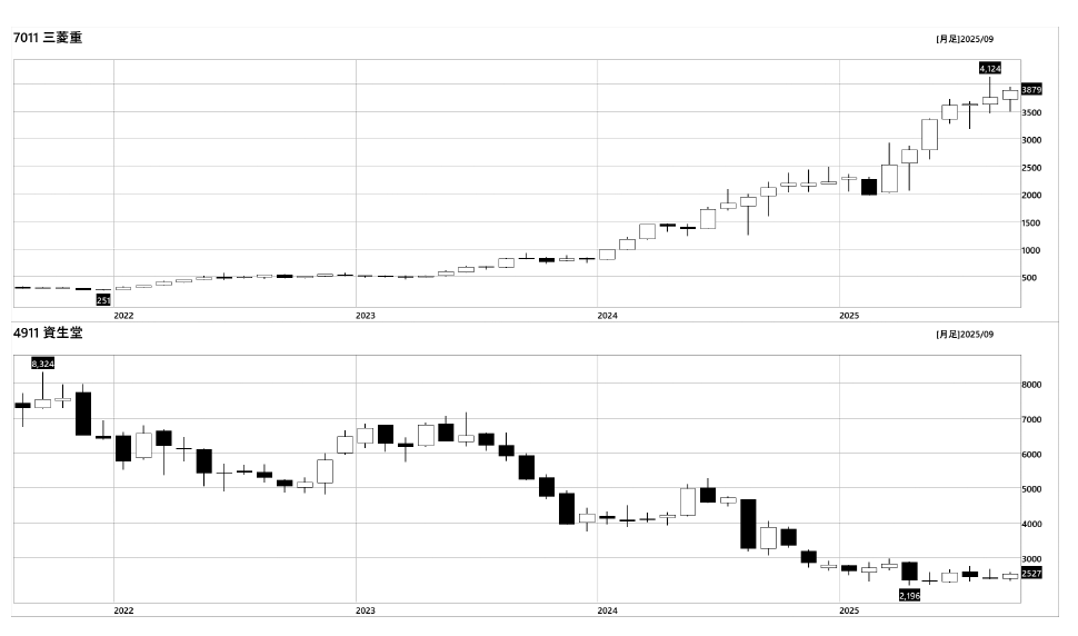 付箋を貼る際は、ローソク足の陽線が多い白いチャートを選びましょう。次のサンプルチャートを見ると、右肩上がりの三菱重工〈7011〉には白(陽線)が多く、株価が右肩下がりの資生堂〈4911〉には黒(陰線)が多くなっているのが分かります。
