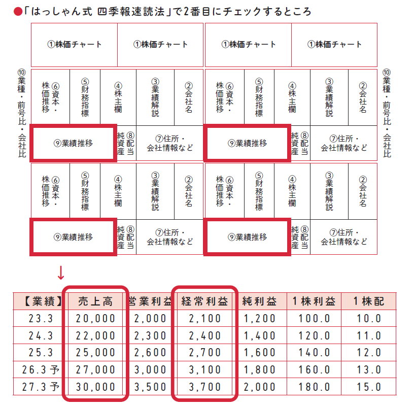 確認するのは、「売上」と「経常利益(または税引前利益)」の推移です。四季報の銘柄欄左下の業績推移欄には、売上や利益の推移が並んでいます。