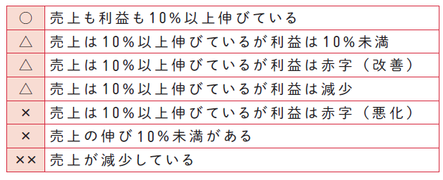 上の表の例のように売上と経常利益(または税引前利益)が継続して成長し続けているかがポイントです。