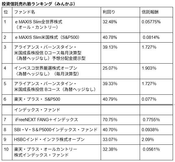 ・インデックスファンド(手数料が安い)……ランキング表の1位や2位の投資信託がこれにあたります。指数に連動するように機械的に買うので、手間がかからず手数料が激安です。