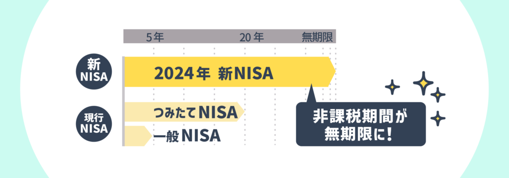この「時間的制限」を取っ払い、非課税期間が「無期限」になったことは多くの個人投資家にとって嬉しいポイントですね。
